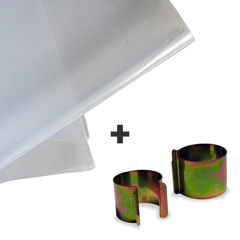Ce pack spécial bâche Serre contient: 1 Bâche Serre 6x8 m translucide, très résistante, étanche, anti-uv de fabrication française + 20 Clips de fixation pour bâche serre 25 x 30mm en Métal revêtement Zinc inoxydable et très résistant